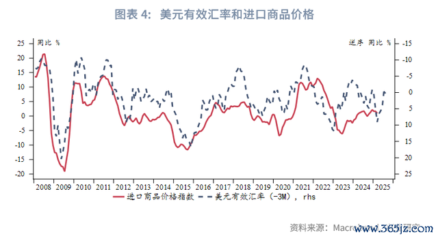 由于目前CPI租金分项同比增速有较大概率进入平台期,将使得服务通胀同比趋于稳定,商品价格的波动对于CPI的影响可能增强。ISM制造业PMI的制造商库存和客户库存差值领先美国商品CPI同比大约3个月,即当制造商持续增加库存、下游库存水平较低时,商品价格上涨;当制造商开始主动降低库存、下游库存增加时,商品价格下跌。当前库存差值显示商品CPI将持续反弹至7月。进口商品物价方面,美元有效汇率同比领先进口物价同比约3个月,近期的美元指数大幅贬值对于进口物价的推升将在未来几个月的CPI开始显现。