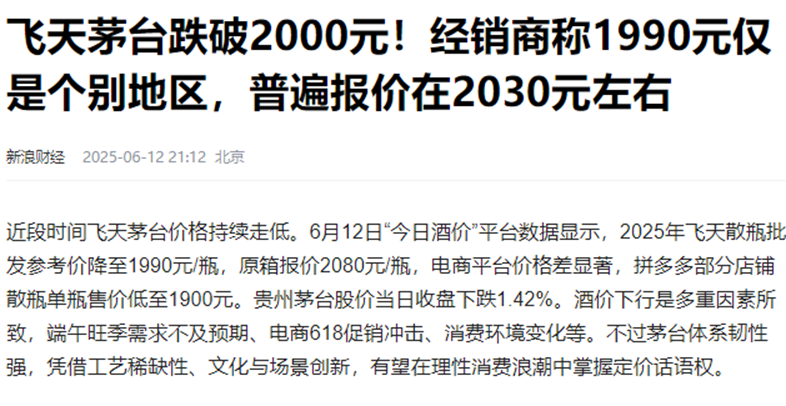 今天最新消息:茅台“跳水”,批发参考价跌破2000元!