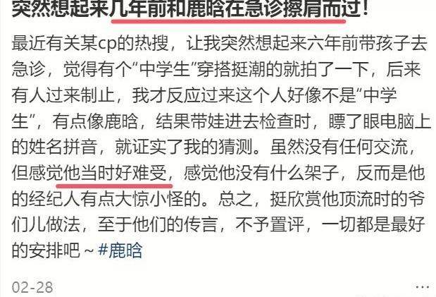 在 6 年前,某位网友就称自己偶遇到鹿晗去看急诊,该网友透露当时鹿晗很难受,全身包裹得紧紧的,两只手环在腰间,表情也不是很好。